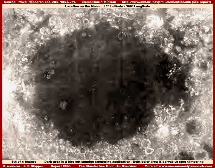 The above sixth and last image in this report demonstrates another area of dark image tampering also imitating one of the maria areas. Again, the dark tampering soft fluffy blurry smudge surface texture clearly identifies it as an artificial application.