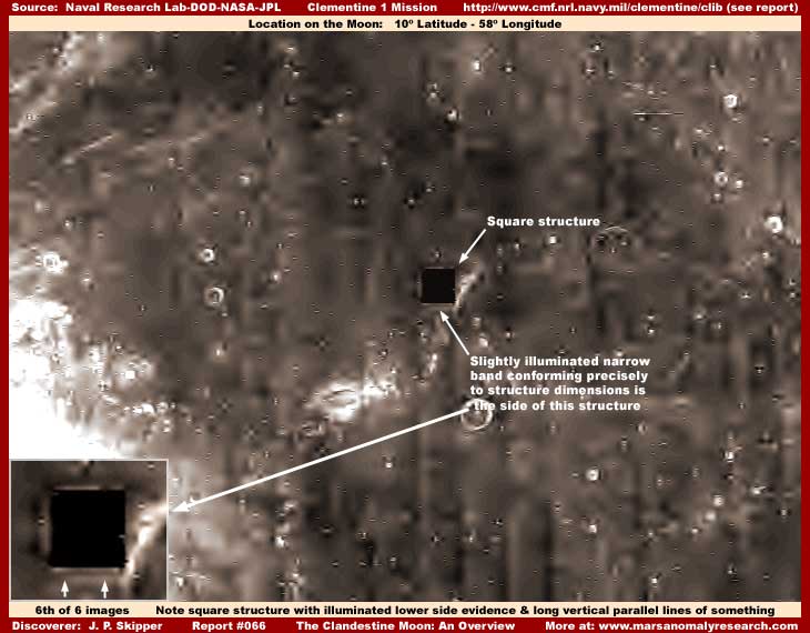 http://www.cmf.nrl.navy.mil/clementine/clib: This link is to the Navy's official CLIB search engine of Clementine Moon imaging based on coordinates to accessing the location of my sixth image above. On the form, click on 1 pixel = 1 kilometer, below that in image size in pixels click on 768x768, below that enter 10 in the Latitude box and 58 in the Longitude box, and then click on the "Use Lat/Long" button to bring up the image. Be forewarned that the image will be darker and less clear than in my imaging above but the black perfectly square structure can still be seen in spite of this obfuscation. Beyond that, graphics software will be needed to achieve the level of brightness, clarity and detail matching my sixth image above.