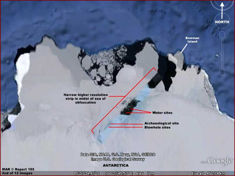 For any who wish to track behind me, the above 1st image is included here to help locate the evidence site on the coastal area of Antarctica at the Southern Sea but inland from the coast. When zooming in on this site in Google Earth, one will encounter a narrow pale blue strip at this location within which the evidence reported on here resides. That pale blue strip is a corridor of high resolution surrounded by an extensive sea of smudge obfuscation and that narrow higher resolution strip is the sole reason why we are able to view just a little truth here.